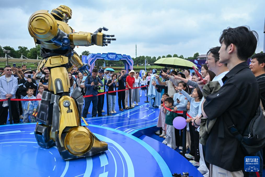 6月2日,在武汉市蔡甸区花博汇景区,游客观看机器人表演。