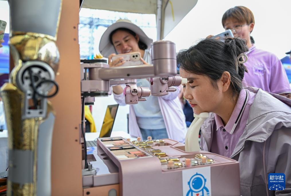 6月2日,在武汉市蔡甸区花博汇景区,游客体验化妆机器人。