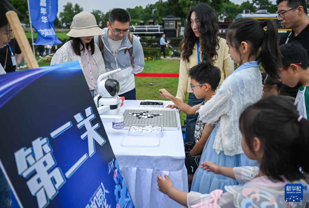 6月2日,在武汉市蔡甸区花博汇景区,游客与机器人下棋。