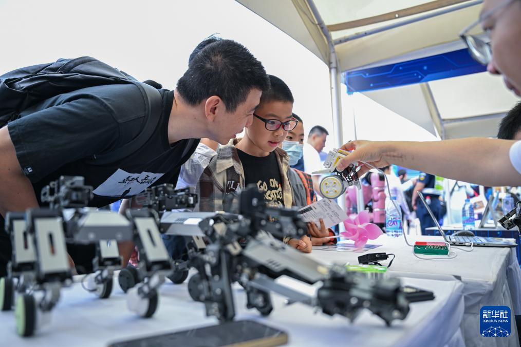 6月2日,在武汉市蔡甸区花博汇景区,游客观看桌面机器人。