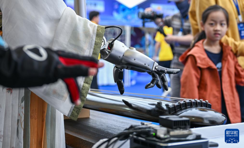 6月2日,在武汉市蔡甸区花博汇景区,游客观看机器人演奏古琴。