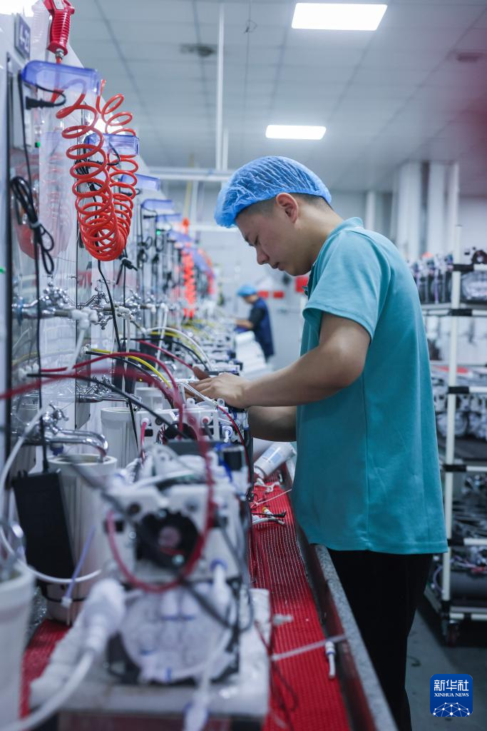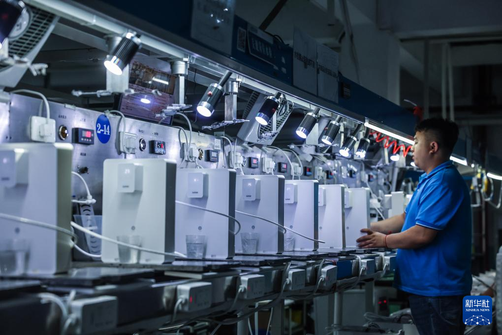 6月5日,在位于浙江慈溪的宁波鼎安电器有限公司车间内,工人在检测线上检测产品。该企业专业生产包含净化、加热、制冷、制冰等核心功能的净饮水器产品,已形成年产60万台整机设备及400万支滤芯的智造能力,也是国家高新技术企业。