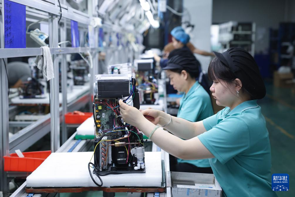 6月5日,在位于浙江慈溪的宁波鼎安电器有限公司车间内,工人在流水线上装配饮水机。该企业专业生产包含净化、加热、制冷、制冰等核心功能的净饮水器产品,已形成年产60万台整机设备及400万支滤芯的智造能力,也是国家高新技术企业。