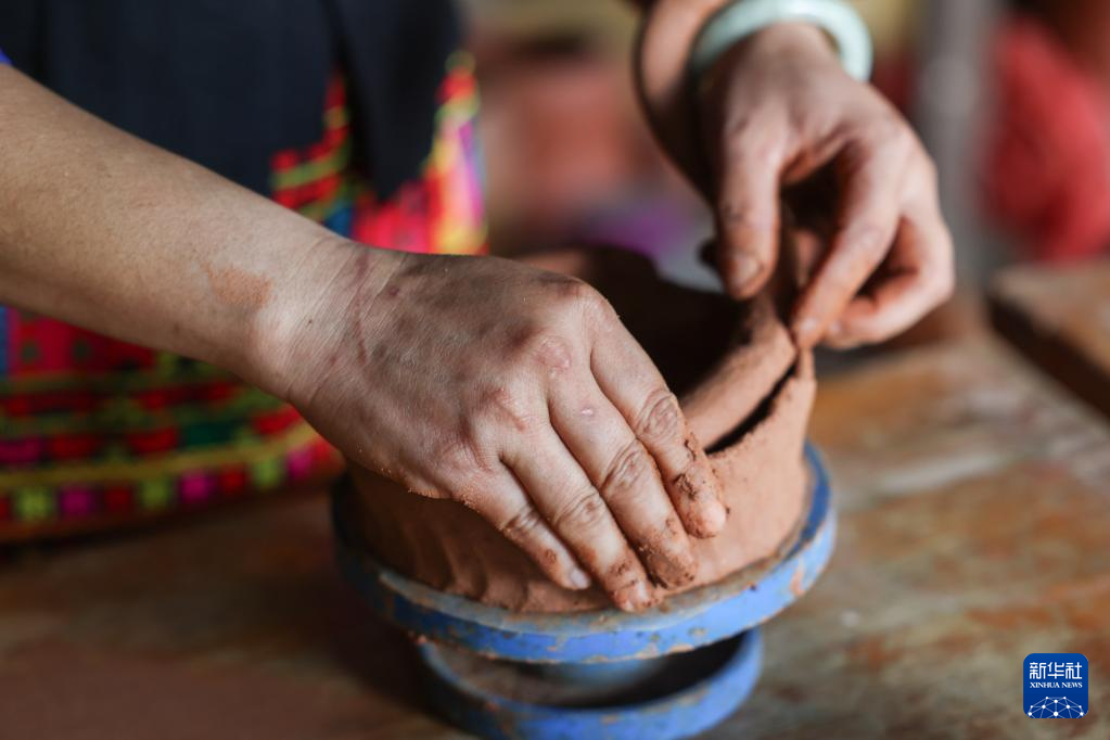 6月9日,在海南三亚黑土黎陶合作社里,村民董佳佳(左)和她的外婆胡其梅制作黎陶。