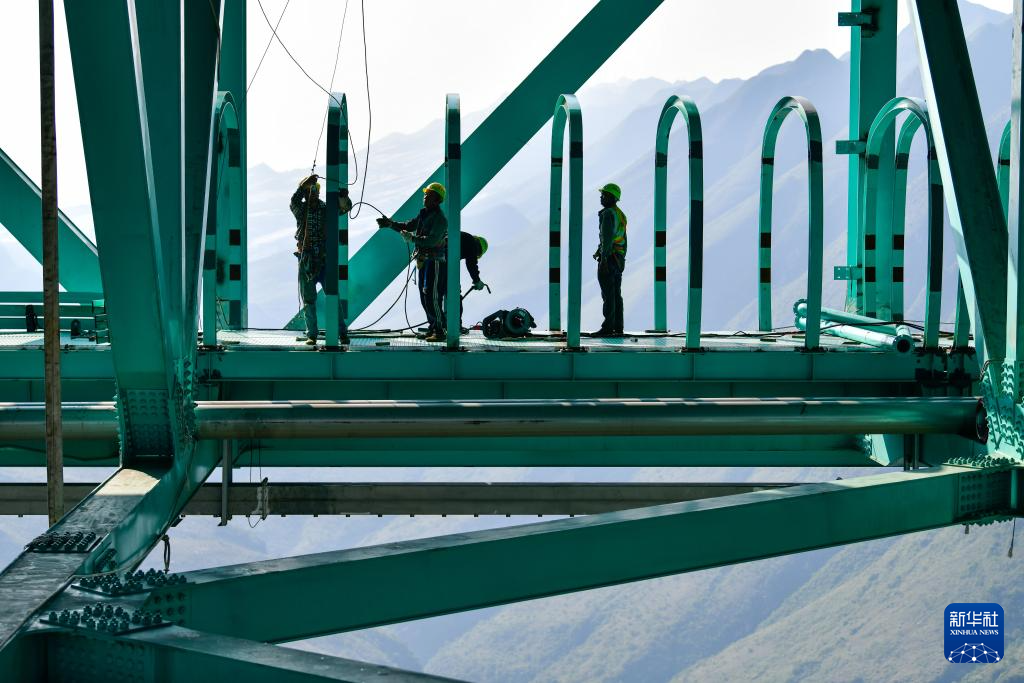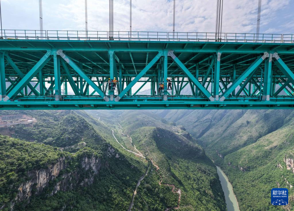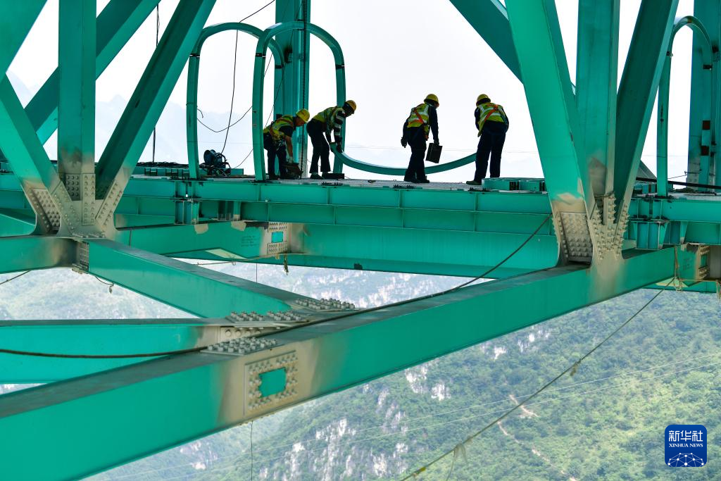 6月11日,建设者在贵州花江峡谷大桥上安装竞速跑道安全绳轨道。