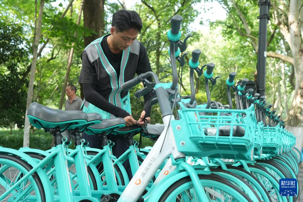6月17日,工作人员将安装好清凉坐垫的共享单车投放到杭州西湖边。