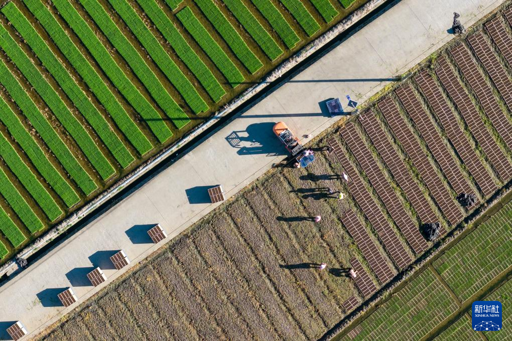 7月7日,浙江省余姚市黄家埠镇上塘村农民在田间摆放晚稻秧盘(无人机照片)。