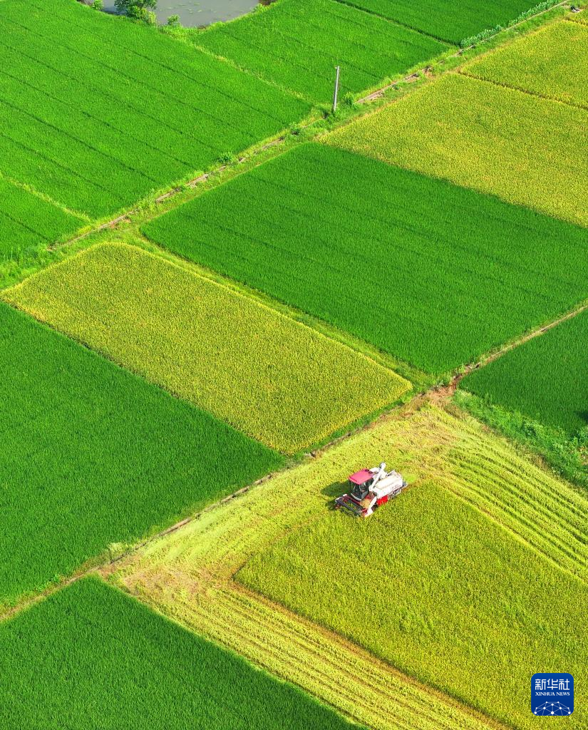 7月7日,湖南省娄底市双峰县荷叶镇石林村,农民驾驶收割机收割早稻。