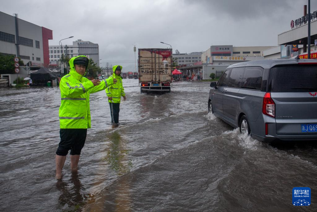 7月8日,浙江省台州市公安局交警支队直属二大队院桥中队民辅警在台州市黄岩区院桥镇一路段积水处执勤,确保道路畅通。