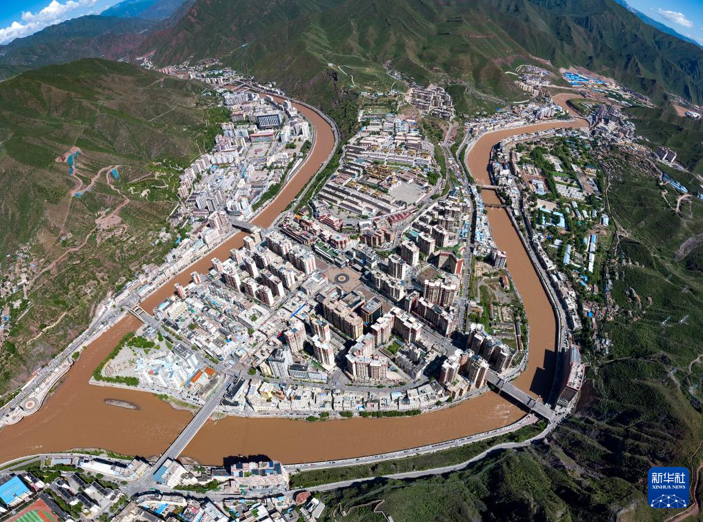 鸟瞰扎曲河和昂曲河交汇处的昌都市(6月21日摄,无人机照片)。