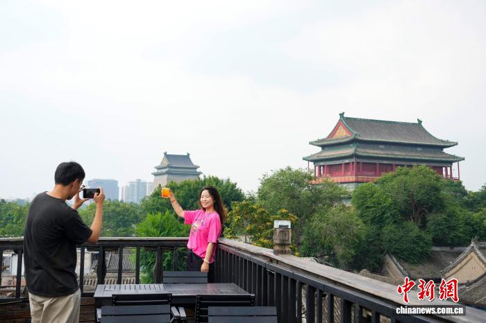 7月26日,游客在北京中轴线上打卡钟鼓楼。 中新社记者 赵文宇摄