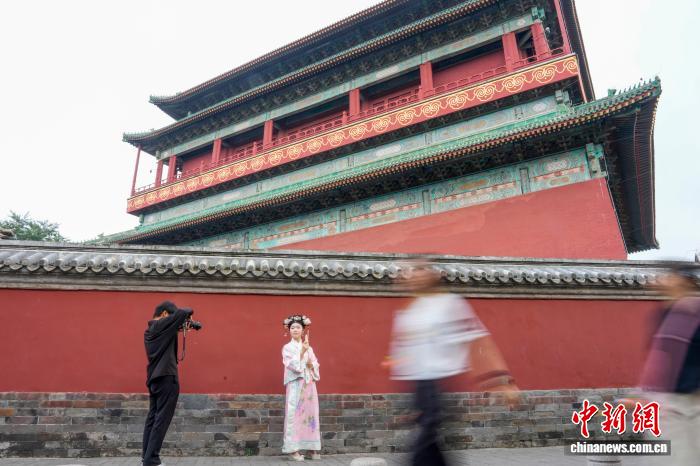 7月26日,游客在位于北京中轴线上的鼓楼下拍照打卡。 中新社记者 赵文宇 摄