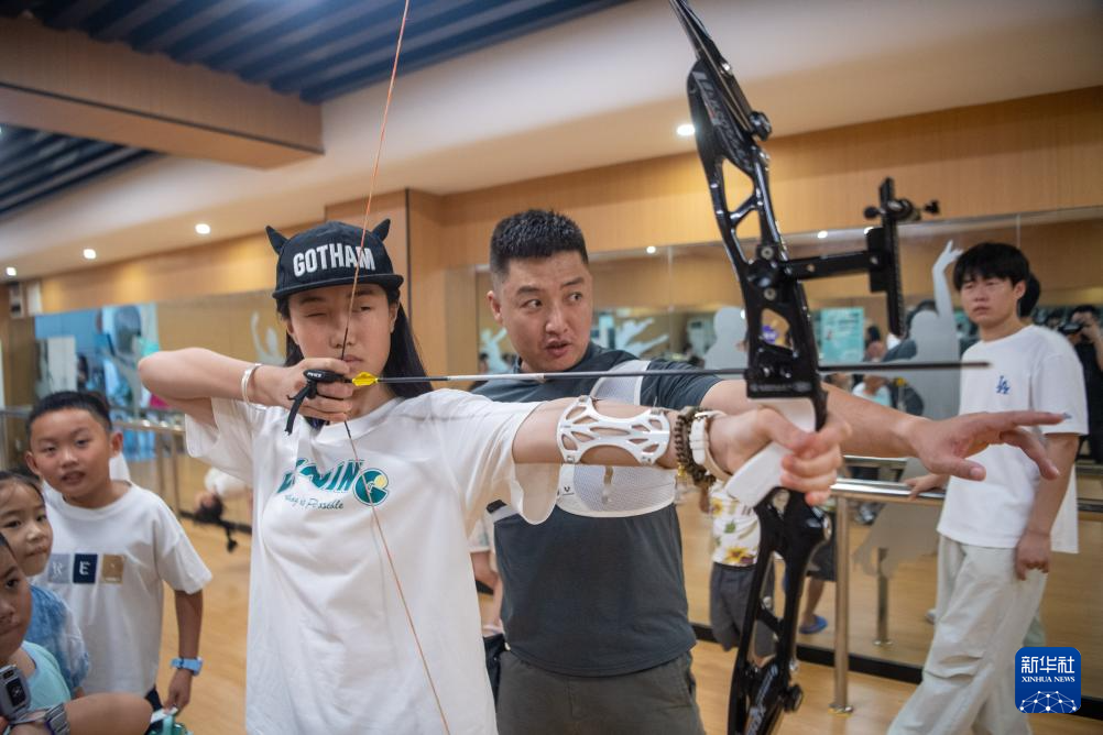 7月31日,在重庆市两江新区大竹林街道竹林社区学院举办的文化艺术游园会活动上,小朋友在工作人员尹占旭(右)的指导下体验射箭。