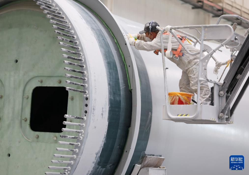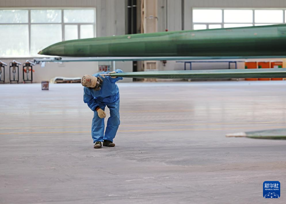 7月30日,在铁岭明阳新能源有限公司车间,工人在加工风力发电机叶片。