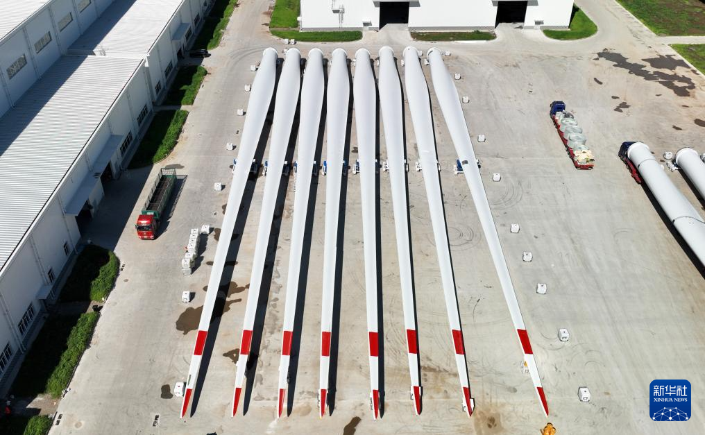 7月30日在铁岭明阳新能源有限公司拍摄的风力发电机叶片(无人机照片)。