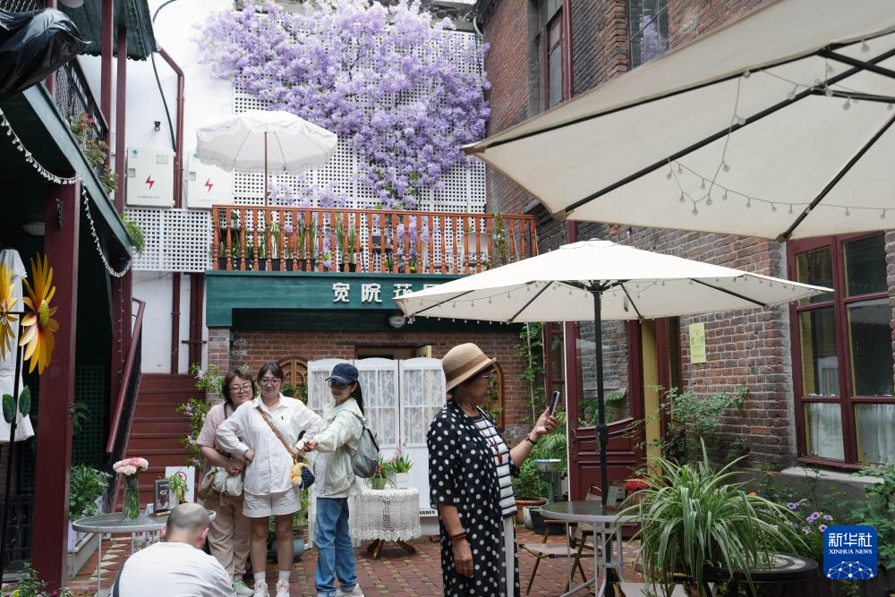 人们在位于哈尔滨市西十三道街的宽街博物馆后院小憩(9月3日摄)。