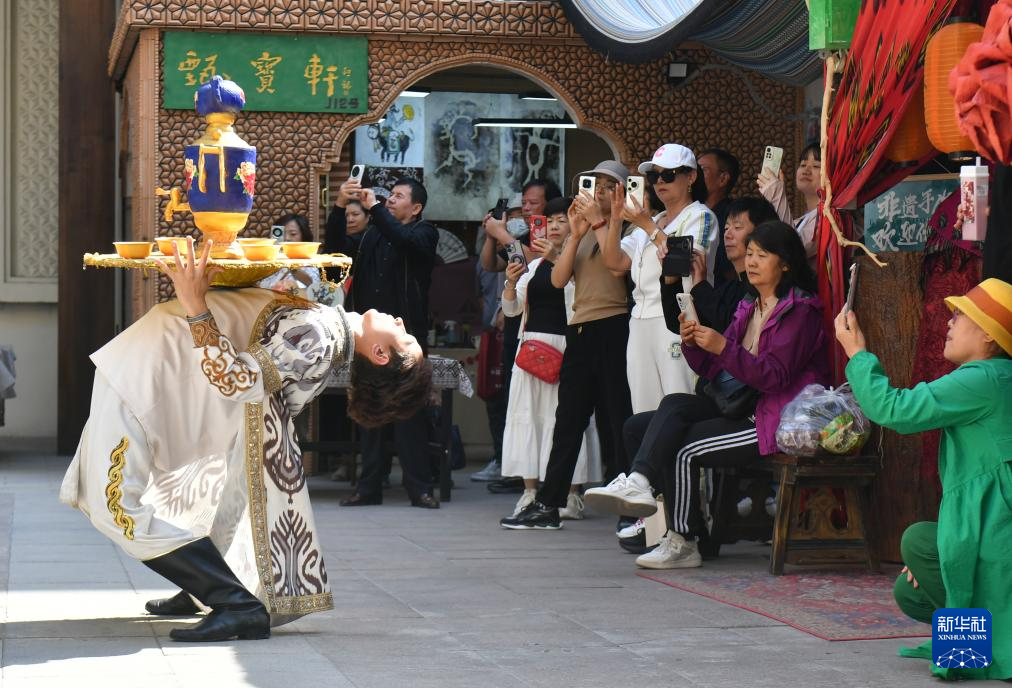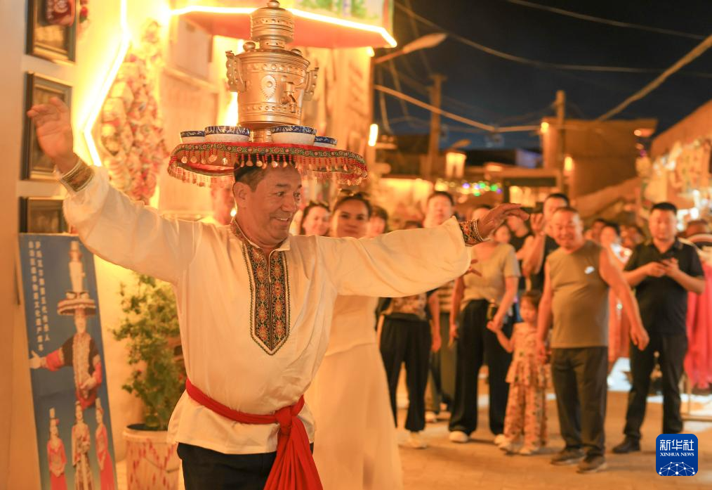 铜盘铜壶稳稳地顶在头上,脚下舞步轻快如风,在新疆库车龟兹小巷内,一群舞者正跳着萨玛瓦尔舞——一种源自千年古龟兹的古老舞蹈。他们的每一个转身都仿佛带着历史的回音,引得围观游客阵阵喝彩。舞至酣时,舞者会邀游客共舞,笑声与乐声融成一片。