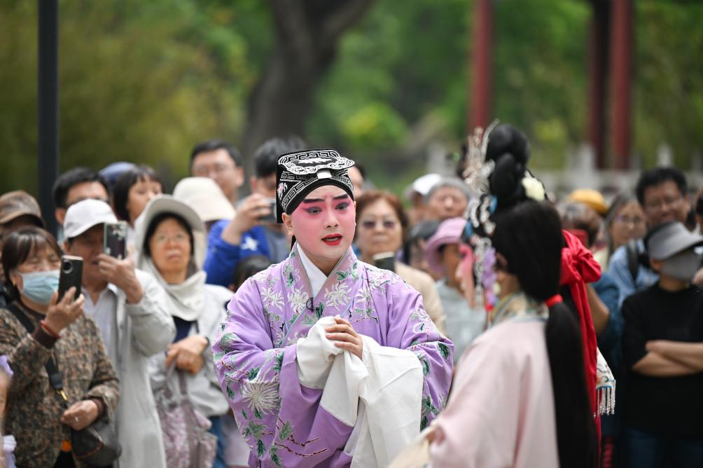 5月5日,演员在天津人民公园为观众表演京剧《西厢记》。新华社记者 孙凡越 摄