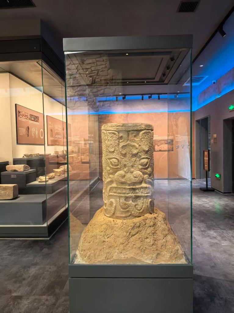 珍藏于石峁博物馆的柱体双神面大石雕。新华社记者张京品 摄
