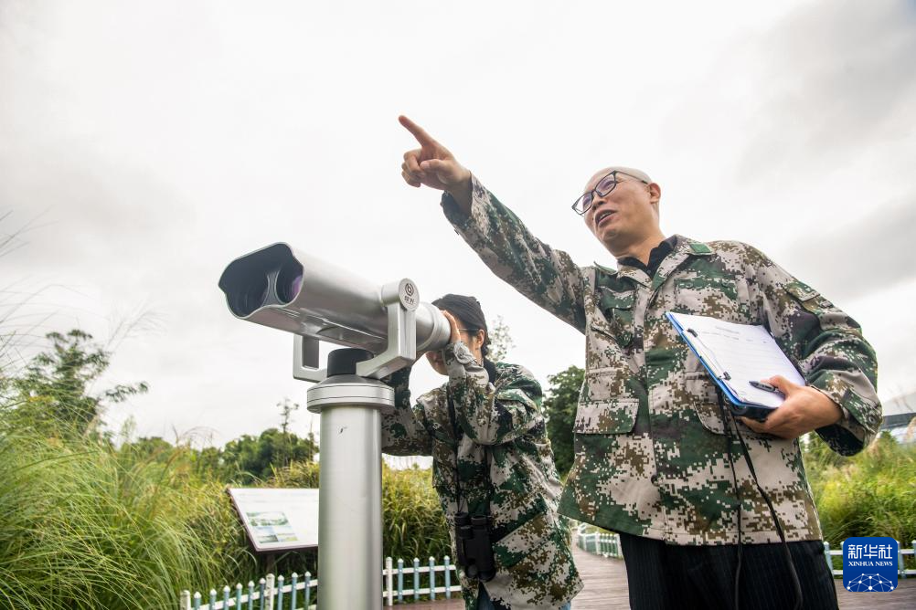 9月26日,重庆市梁平区湿地保护中心工作人员余先怀(右)、吕妮洪在双桂湖国家湿地公园内使用望远镜观测鸟群。