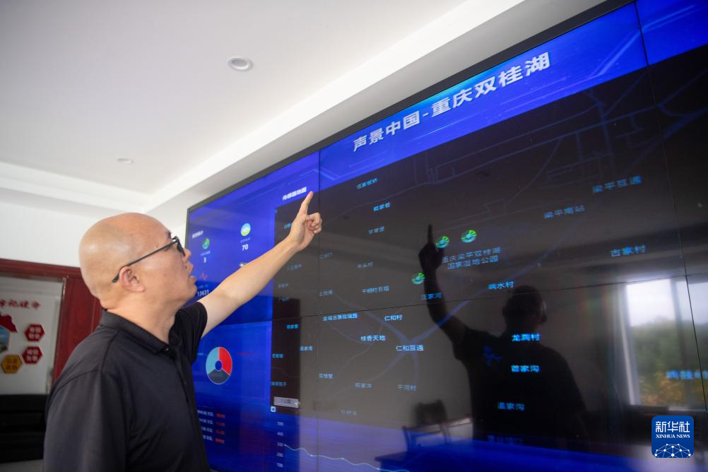 9月26日,重庆市梁平区湿地保护中心工作人员余先怀在双桂湖国家湿地公园内介绍鸟类AI监测大数据平台。