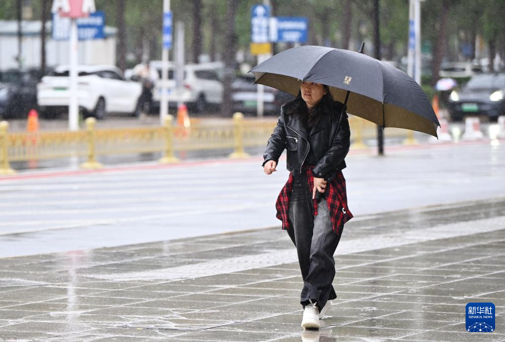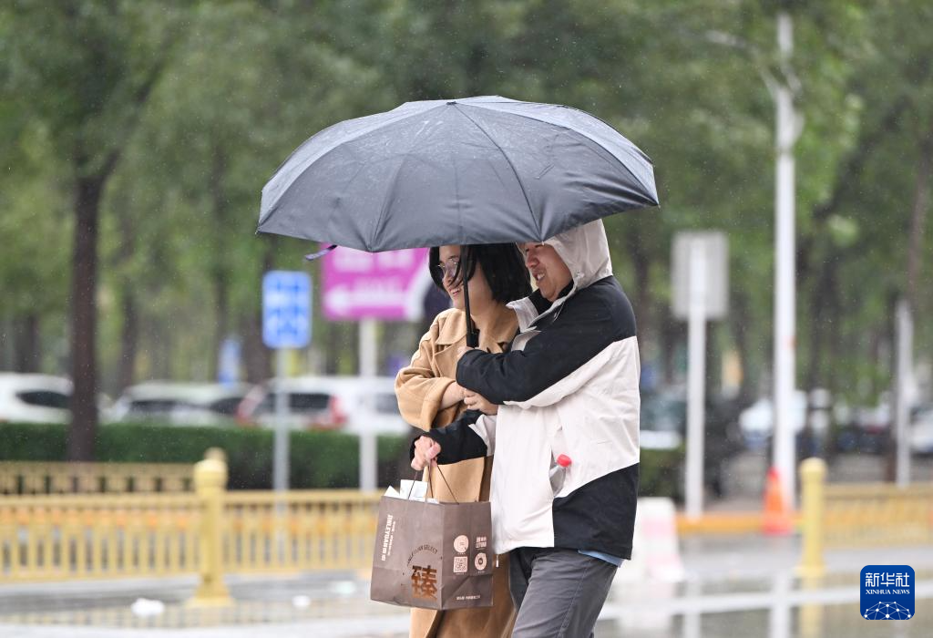 10月9日,在天津市南开区,市民在雨中出行。