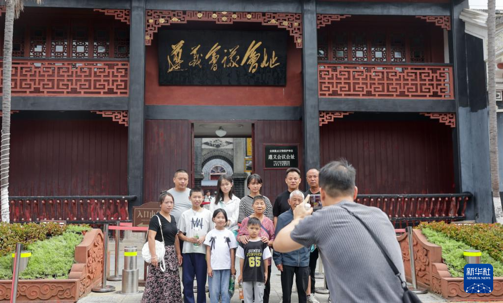 10月8日,游客在贵州省遵义市遵义会议会址合影留念。