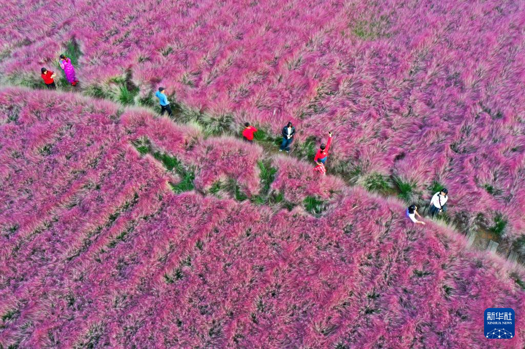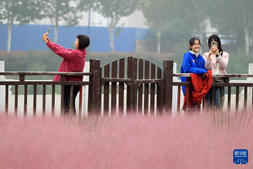 10月8日,游客在河南省许昌市清潩河畔粉黛乱子草园游玩拍照。