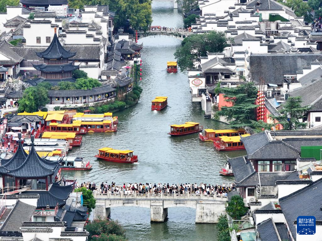 10月1日,游客在南京夫子庙景区游览(无人机照片)。