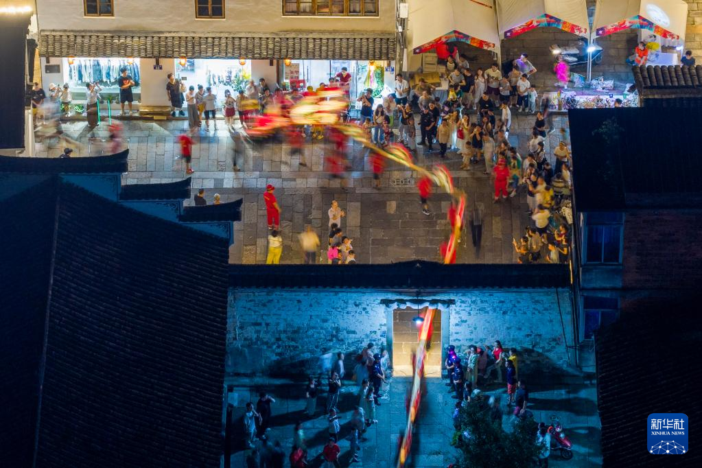 10月5日,游客在浙江省浦江县东街欣赏板凳龙巡游(无人机照片)。