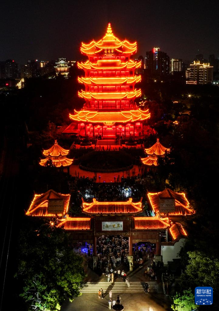 10月7日晚,游客在武汉黄鹤楼游览(无人机照片)。