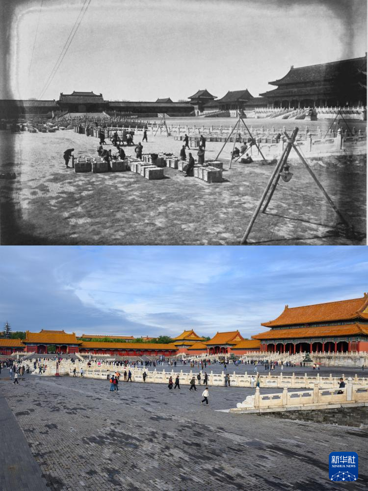 拼版照片:上图为1933年2月拍摄的太和门广场第一批文物南迁时的情景(故宫博物院供图);下图为2025年10月10日拍摄的太和门广场(新华社记者金良快摄)。