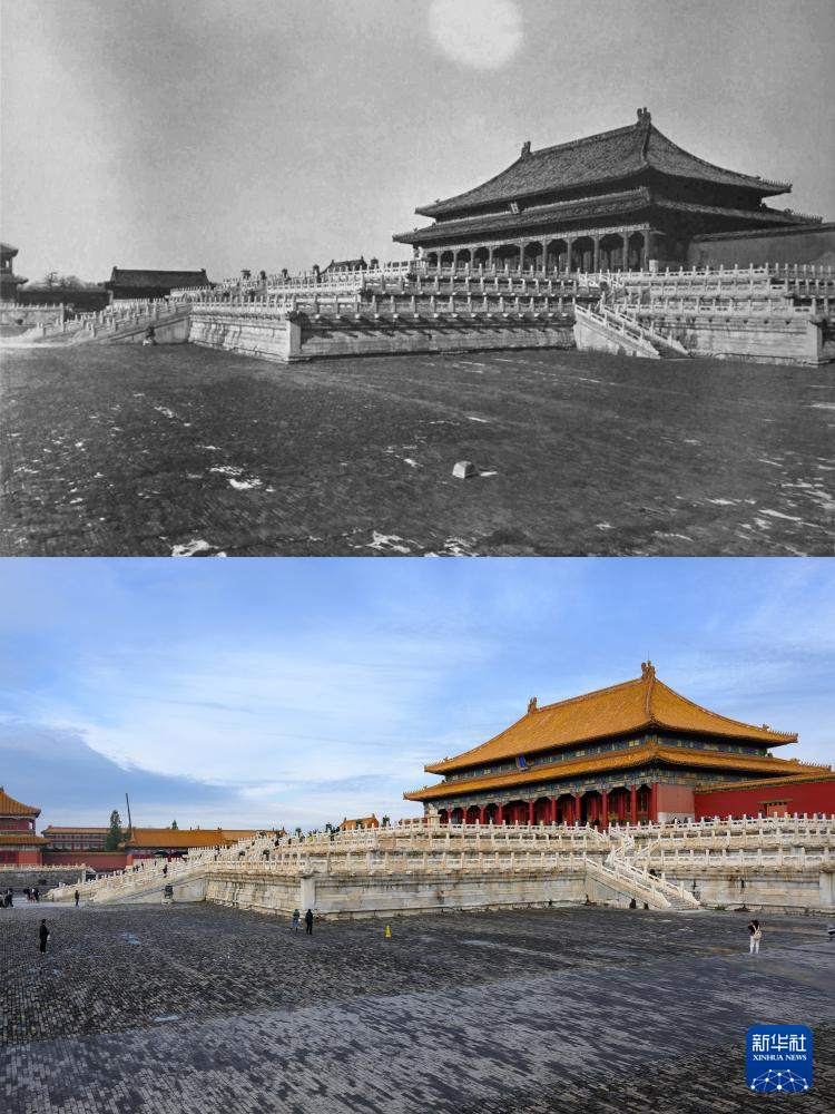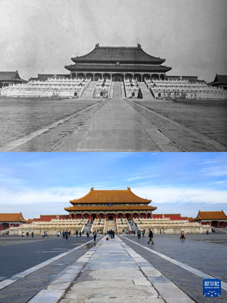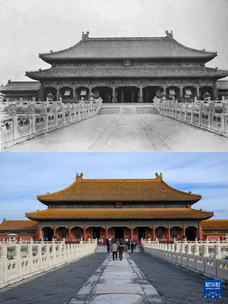 拼版照片:上图为20世纪初拍摄的太和殿(故宫博物院供图);下图为2025年10月10日拍摄的太和殿(新华社记者金良快摄)。