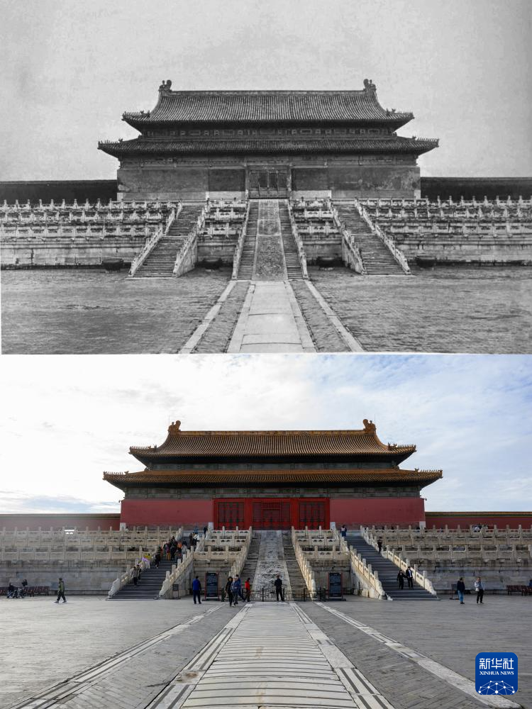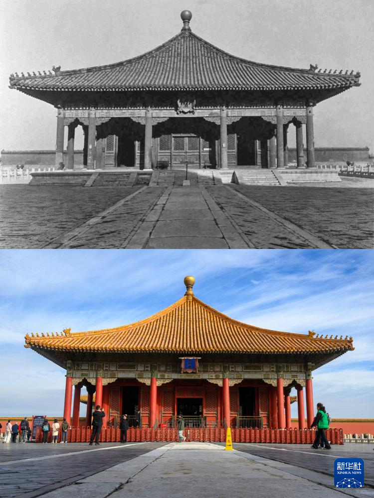 拼版照片:上图为20世纪初拍摄的中和殿(故宫博物院供图);下图为2025年10月10日拍摄的中和殿(新华社记者金良快摄)。