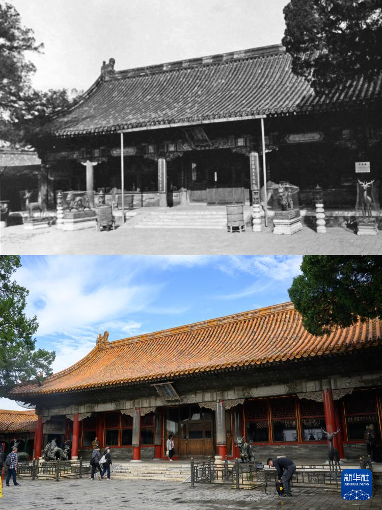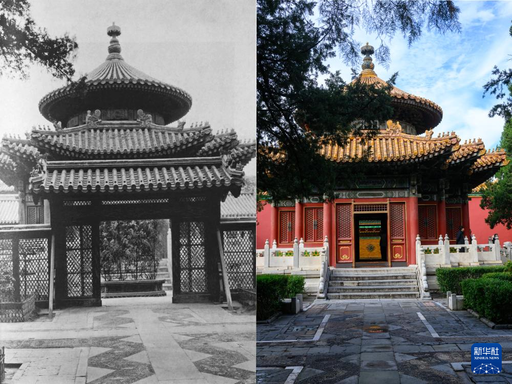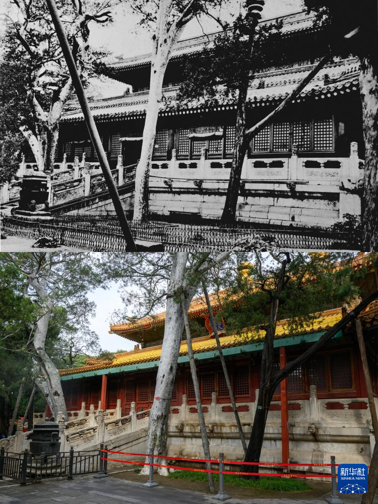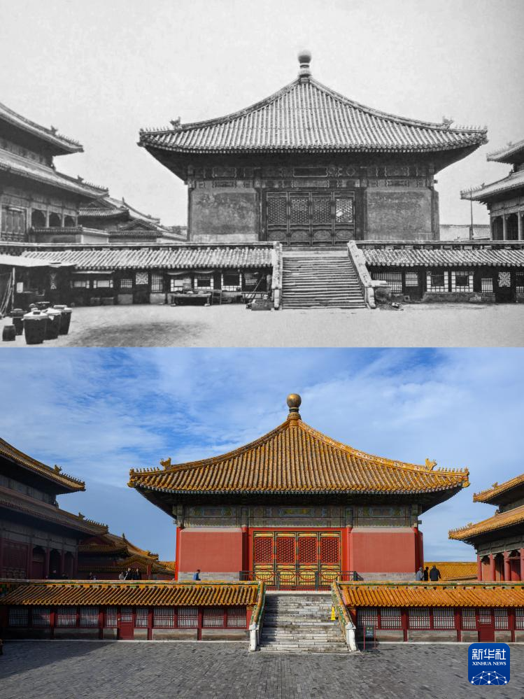 拼版照片:上图为20世纪初拍摄的交泰殿(故宫博物院供图);下图为2025年10月10日拍摄的交泰殿(新华社记者金良快摄)。