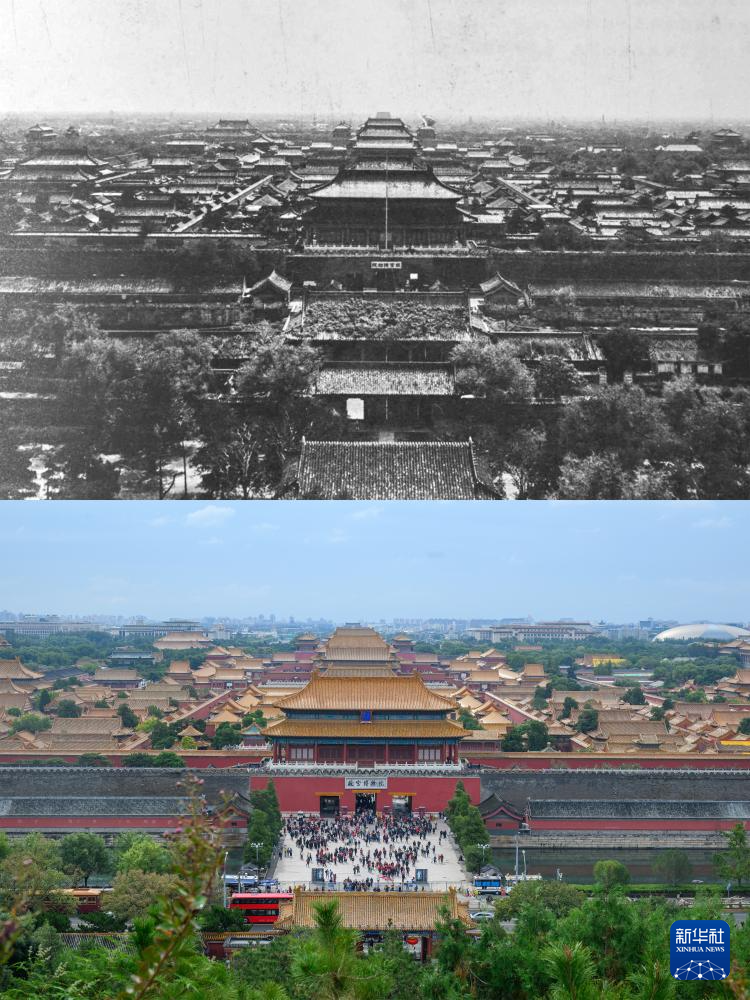 拼版照片:上图为20世纪前期拍摄的神武门(故宫博物院供图);下图为2025年10月10日拍摄的神武门(新华社记者金良快摄)。