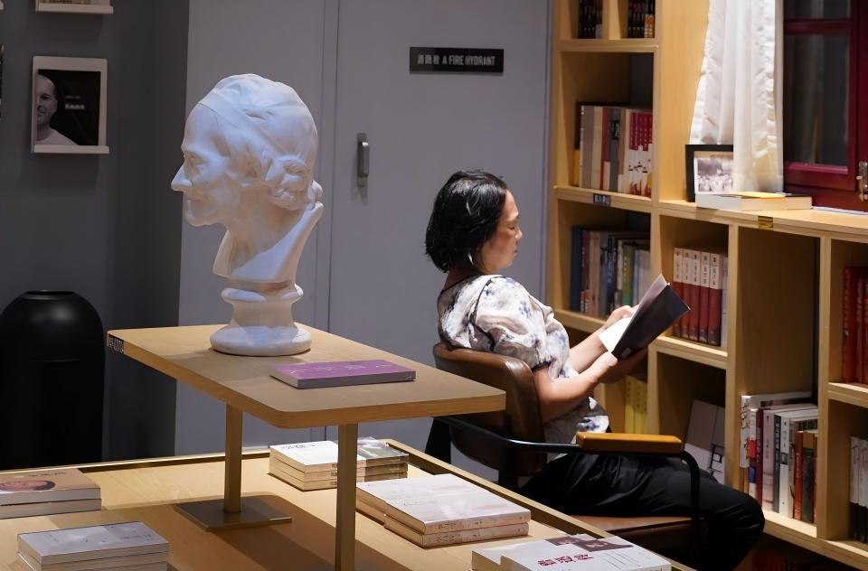 2025年9月9日夜晚,一位读者正在安庆前言后记书店劝业场店看书。(安庆市新闻传媒中心汪飞龙 摄)