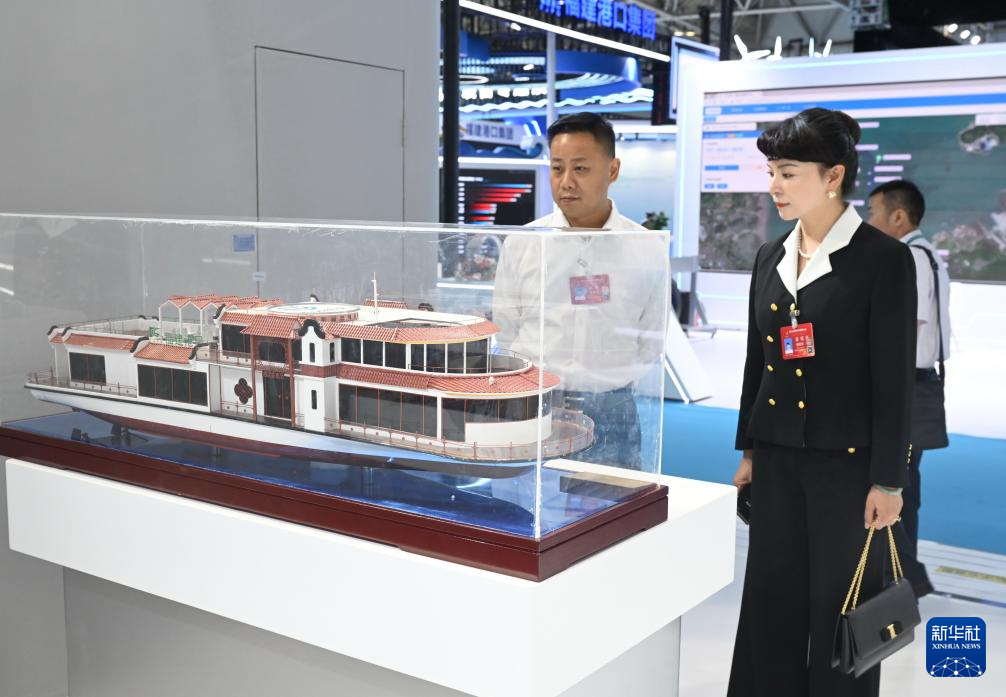 10月16日,与会人员在宁德时代展区观看“闽江会客厅”电动游船模型。