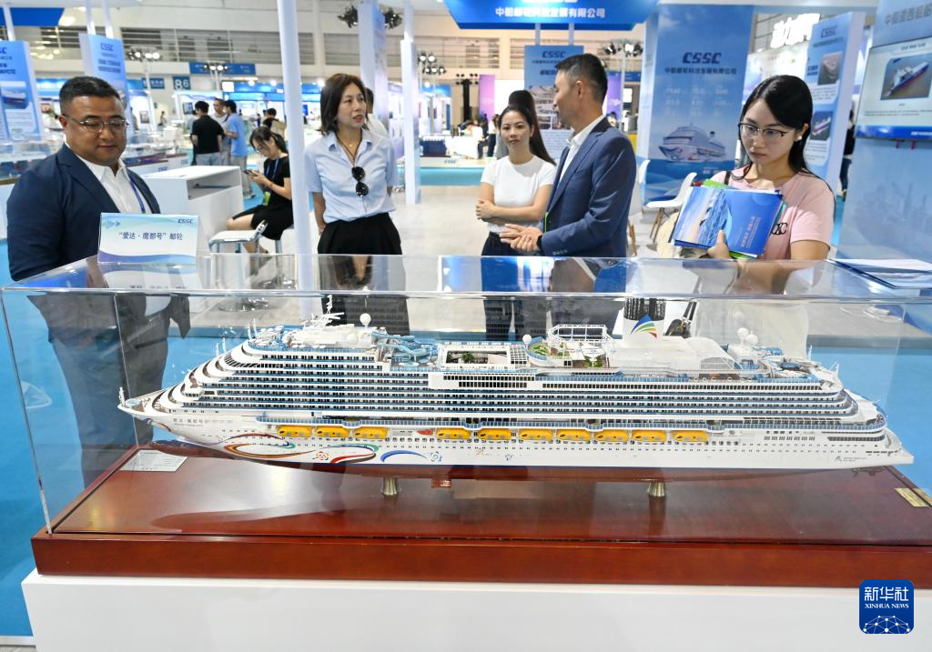 10月16日,与会人员在中国海洋装备博览会现场观看“爱达·魔都号”邮轮模型。