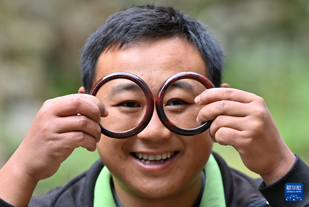 10月21日,在广西龙胜各族自治县三门镇大地村,村民蒙骏宁展示自己加工的一对手镯。