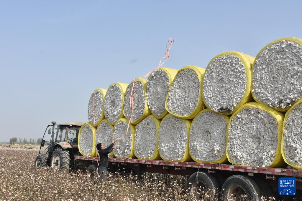10月21日,在新疆阿克苏地区沙雅县,打包好的棉花被送往轧花厂。