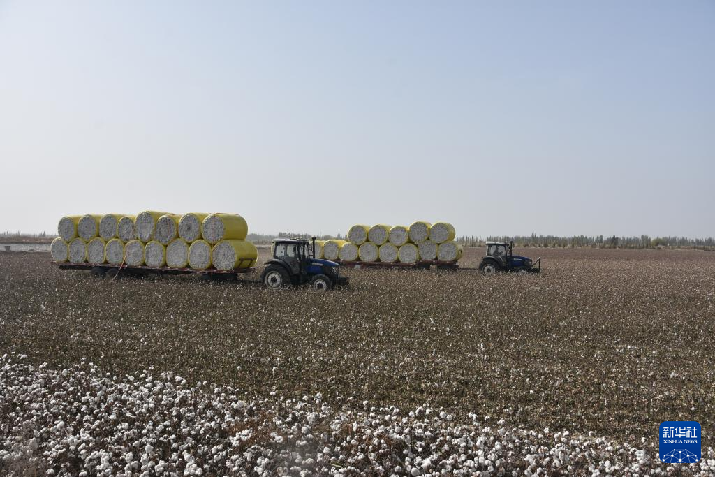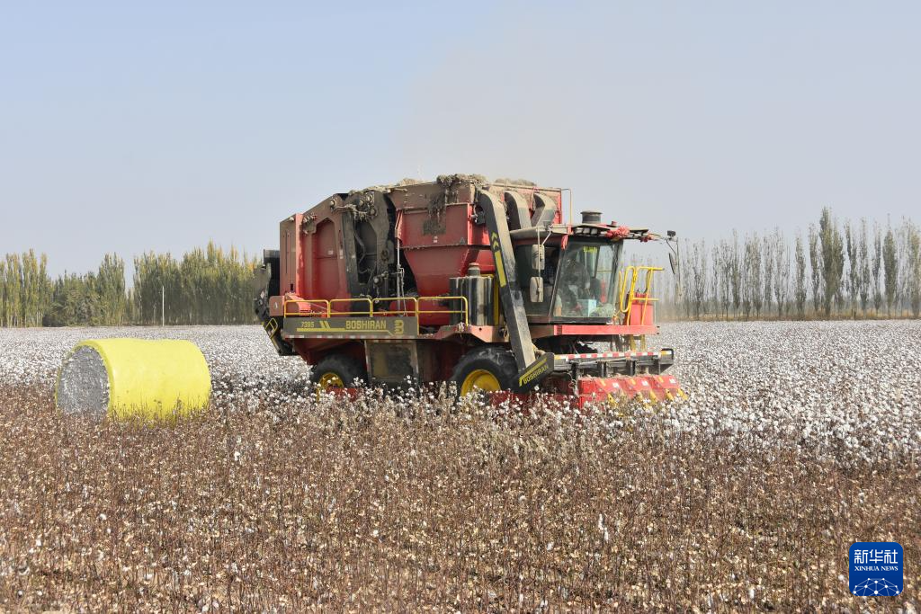 10月21日,采棉机在新疆阿克苏地区沙雅县的棉田中工作,旁边是刚采收打包好的棉花。