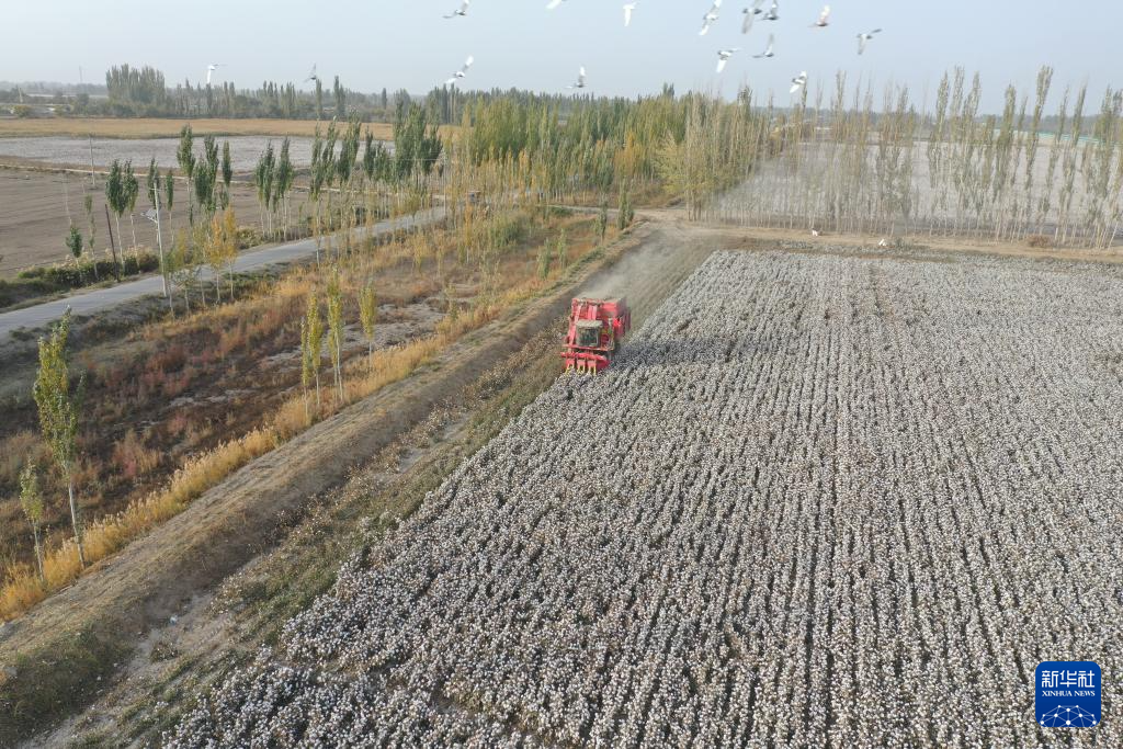 金秋十月,新疆阿克苏地区沙雅县187万亩棉田迎来采收高峰,雪白的棉海一眼望不到头。数台大型采棉机穿梭其间,朵朵棉花被采棉机采摘、收集、打包、出仓,棉田里一派丰收繁忙景象。
