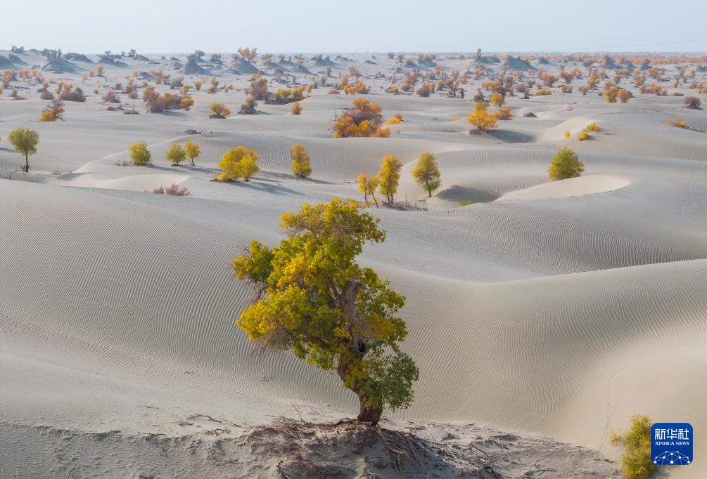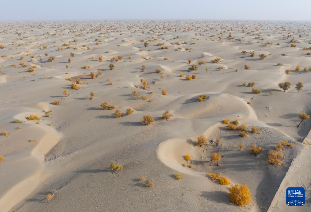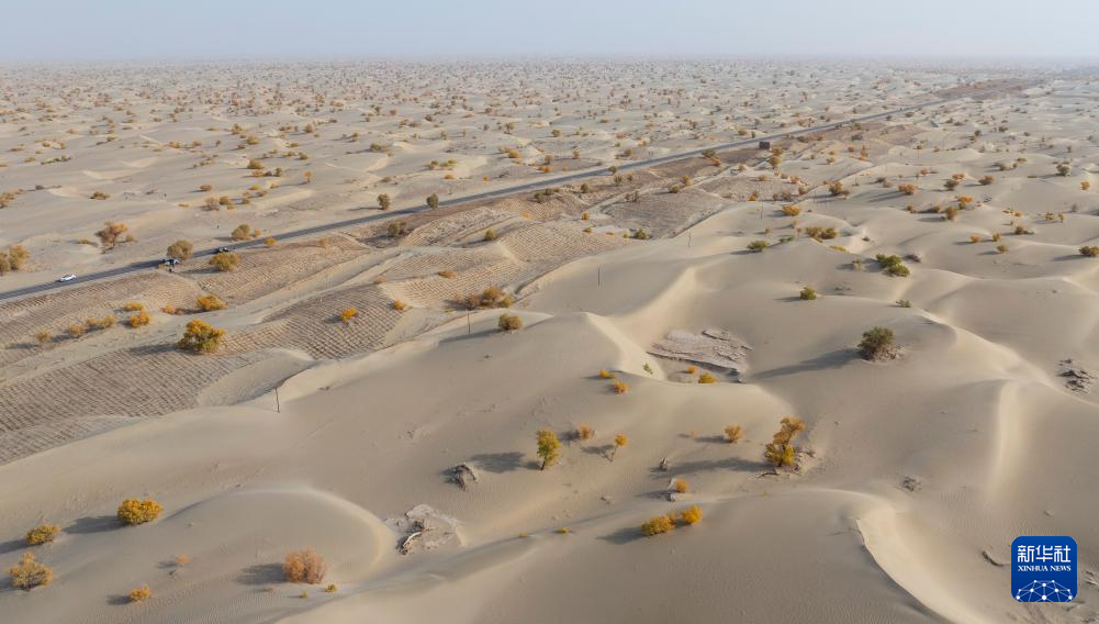 10月23日在新疆生产建设兵团第一师阿拉尔市的阿拉尔至和田沙漠公路附近拍摄的胡杨林(无人机照片)。