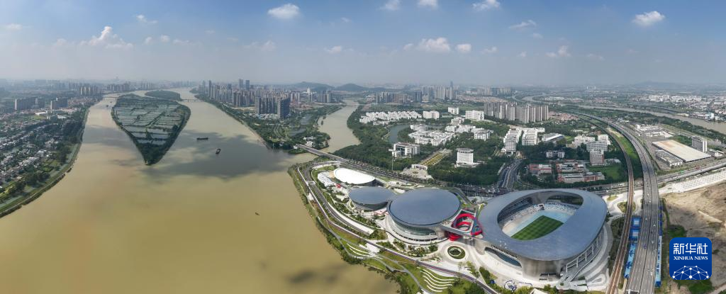 广东佛山顺德德胜体育中心部分景观(10月18日摄,无人机照片)。全运会足球女子成年组、篮球女子成年组比赛在这里举行。