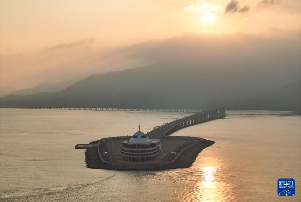 晨曦中的港珠澳大桥和蓝海豚岛(10月19日摄,无人机照片)。港珠澳大桥是全运会公路自行车项目途经地,一桥串联粤港澳三地。