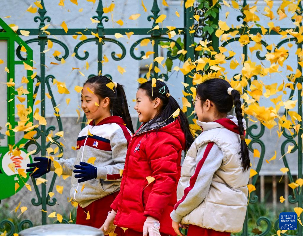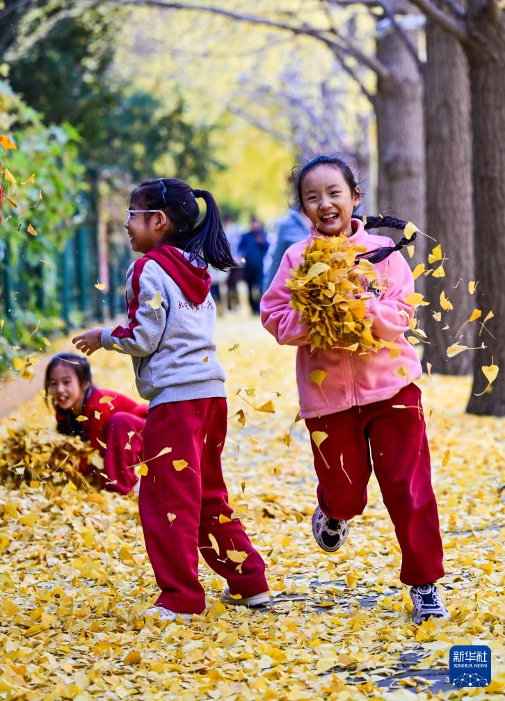 11月12日,三名小女孩在北京西城区什坊小街旁抛起银杏落叶。
