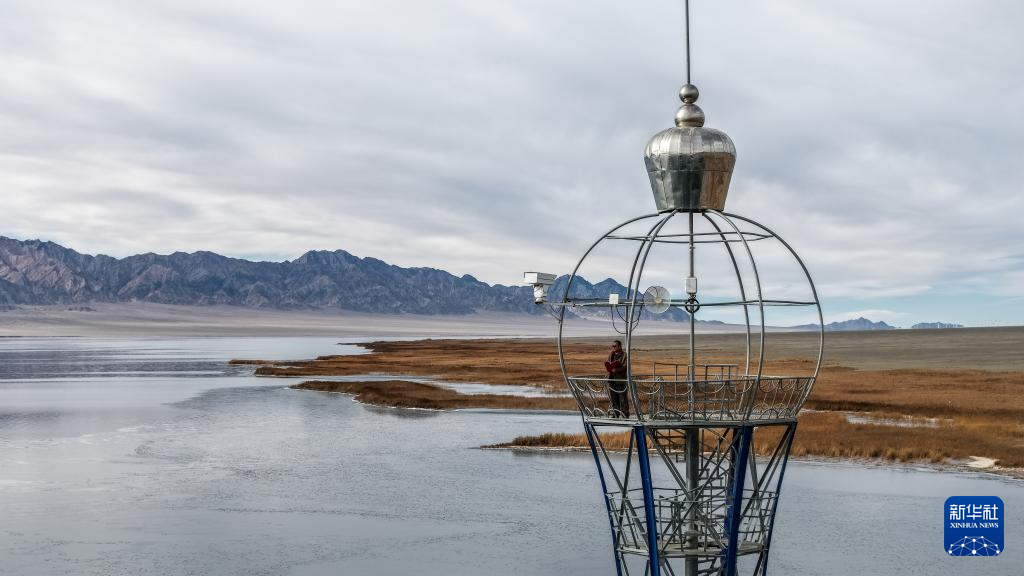 11月16日,护林员在甘肃省阿克塞县大苏干湖省级候鸟自然保护区的一处瞭望塔上观测湖面结冰情况(无人机照片)。