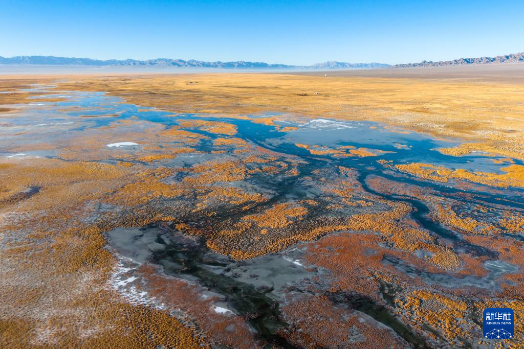 这是11月14日在甘肃省酒泉市阿克塞县阿伊纳乡拍摄的小苏干湖风光(无人机照片)。