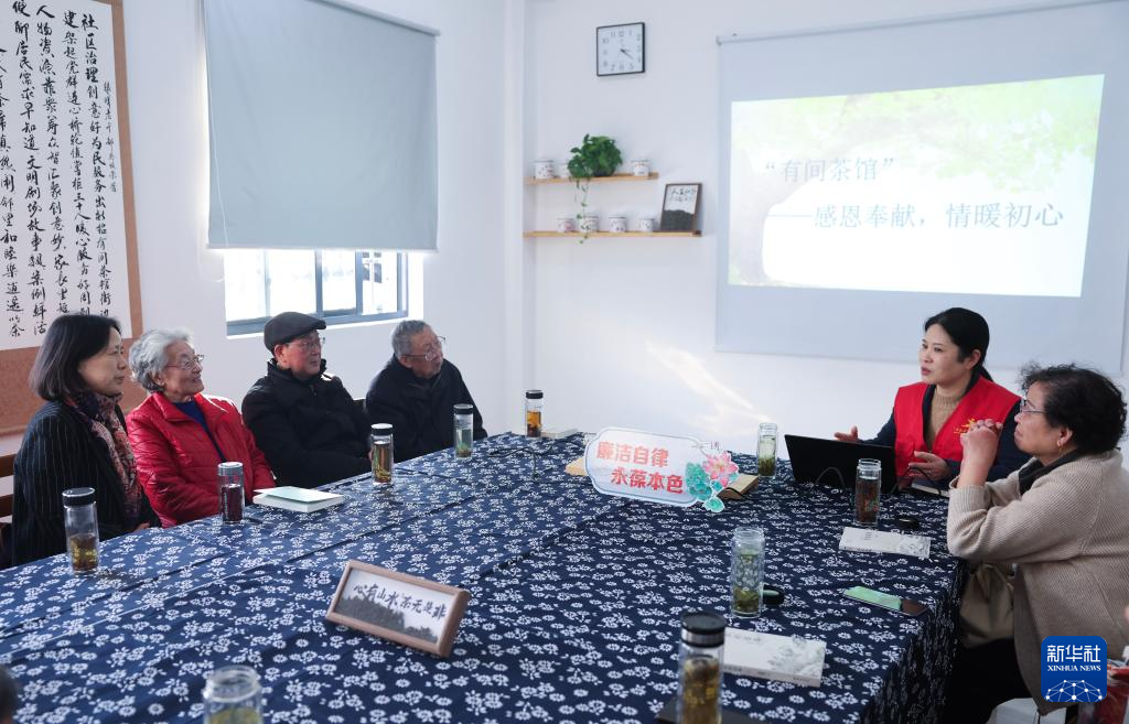 12月11日,在浙江省嘉兴市南湖区电子社区“有间茶馆”内,社区党员志愿者(右二)听取关于社区事务的意见和建议。